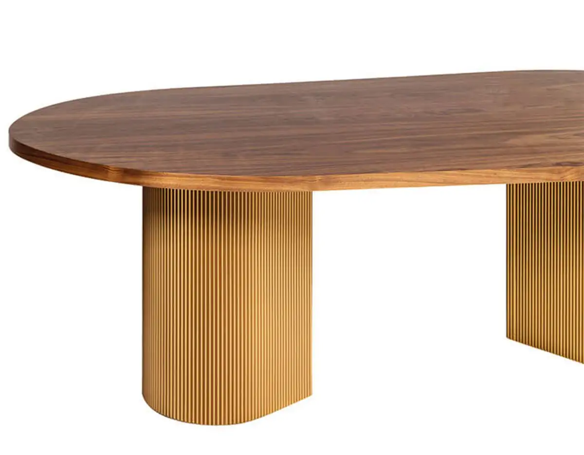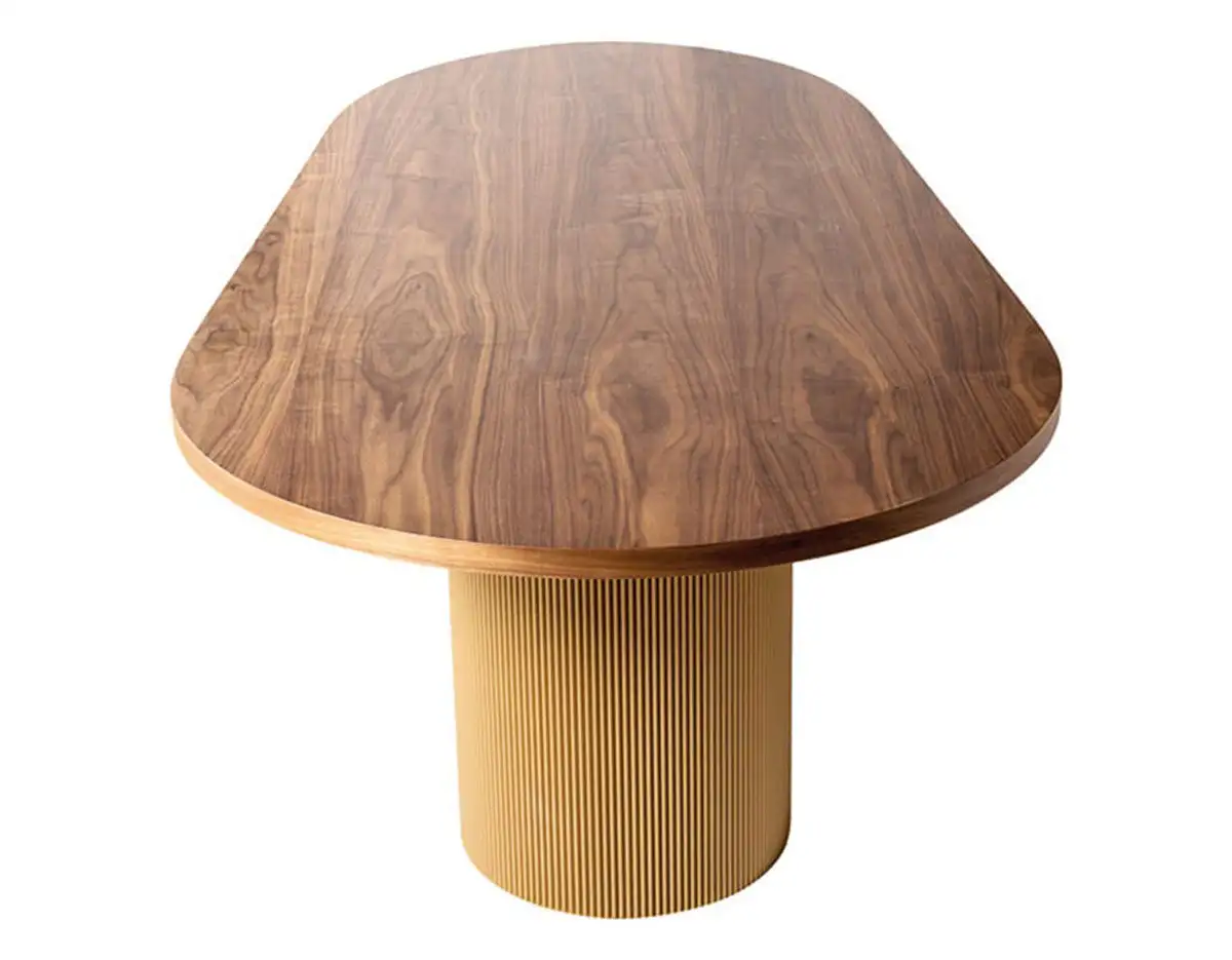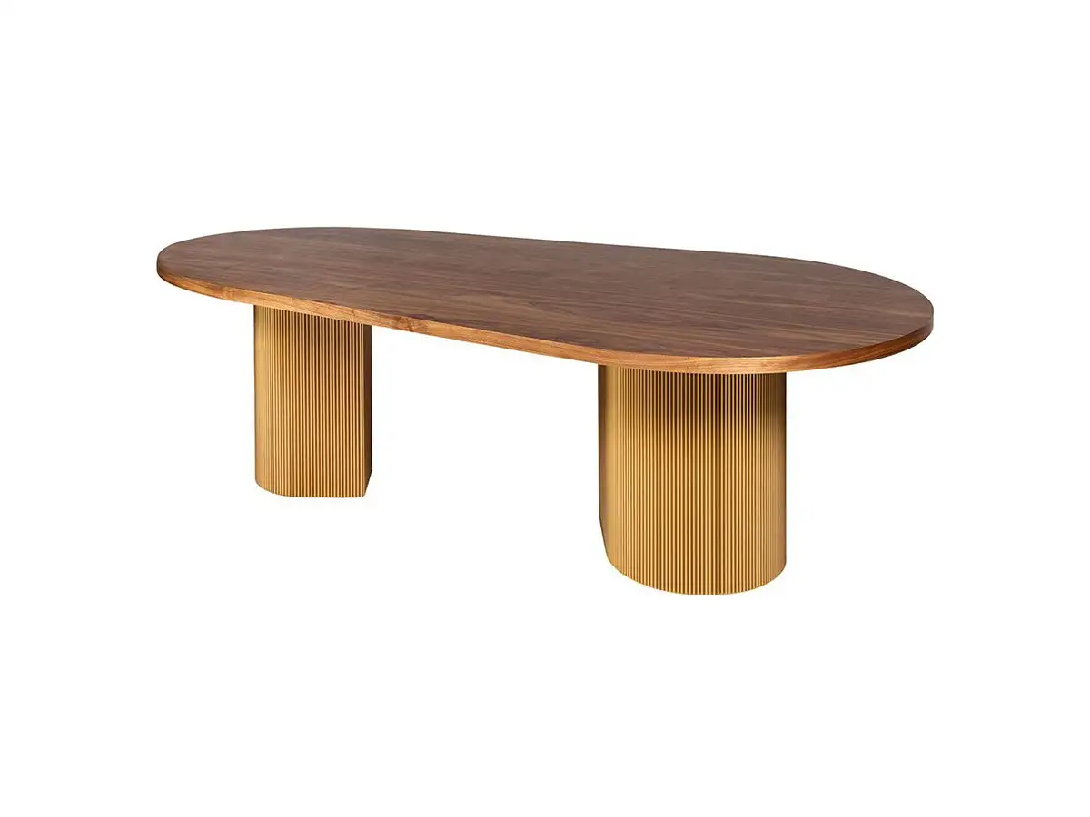 Το dakry bf dining τραπέζι έχει δυο άνισες βάσεις, μια μεγαλύτερη και μια μικρότερη όπου και οι δύο έχουν το σχήμα της σταγόνας. Είναι ριγωτές και πάντα βαμένες μεταλλική λάκα. Το καπάκι έχει οργανικό σχήμα, πάχους 4εκ. πάντα σε ξύλο.