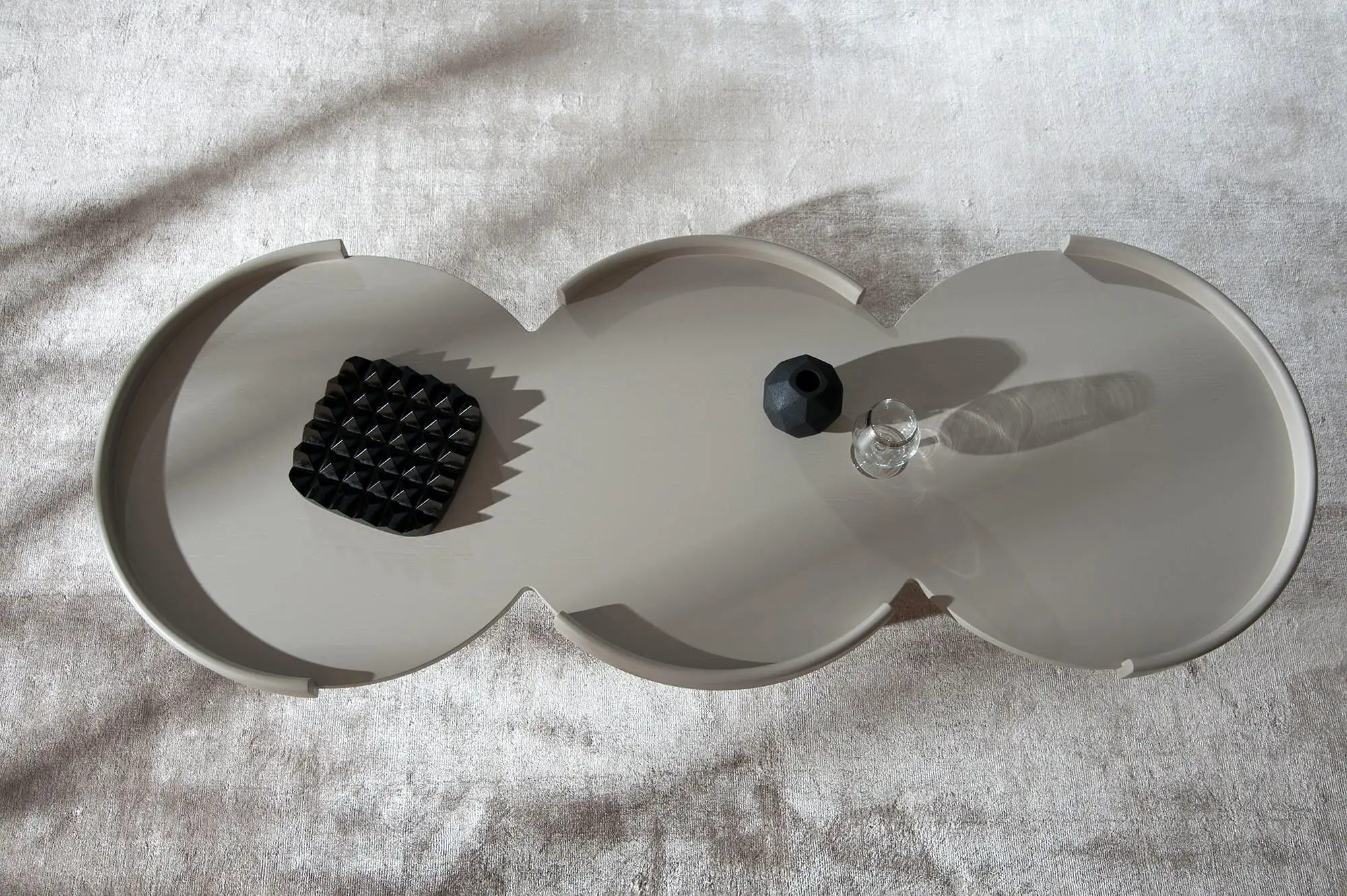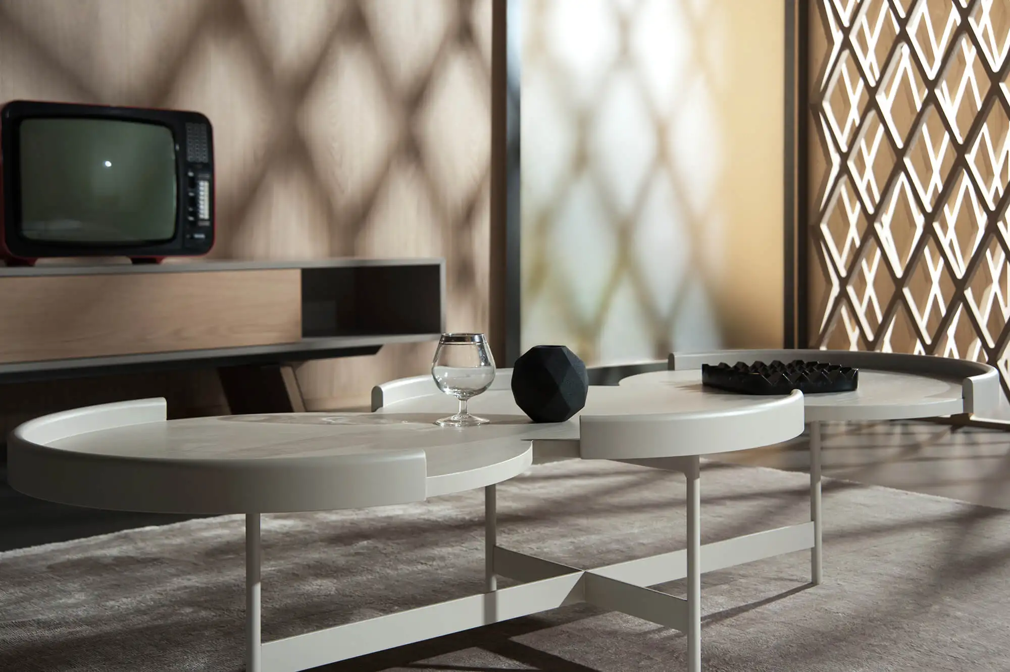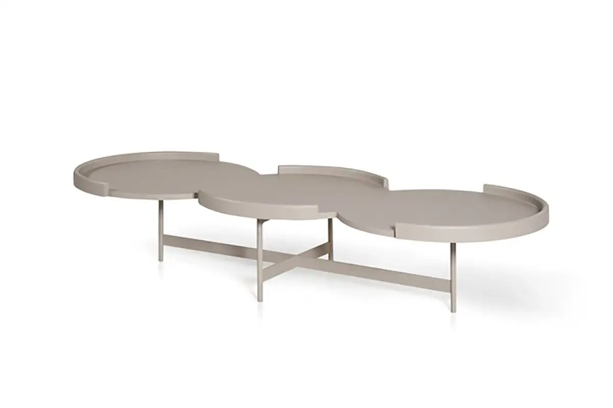 Low table with wooden circular tops and metal base.