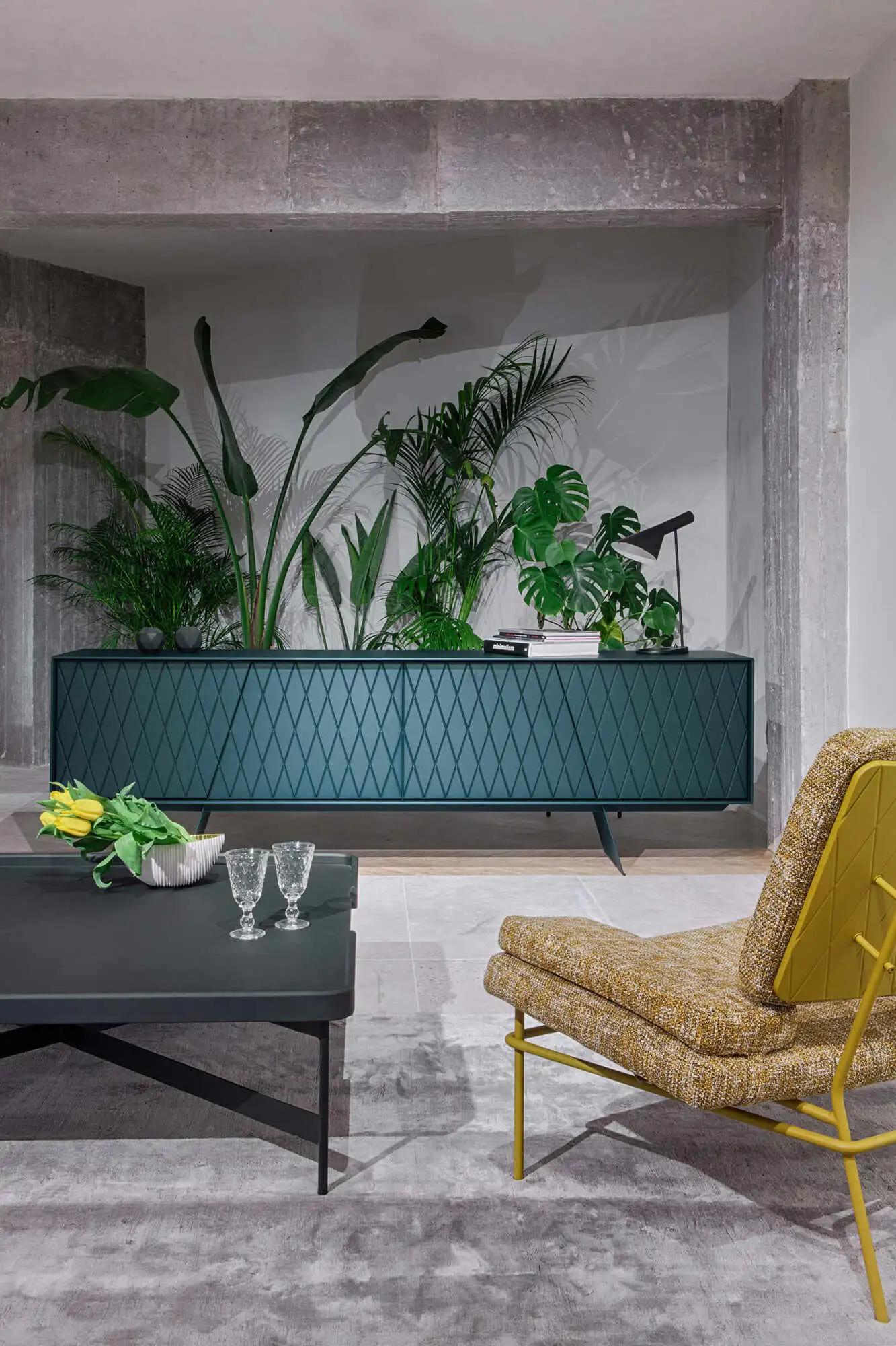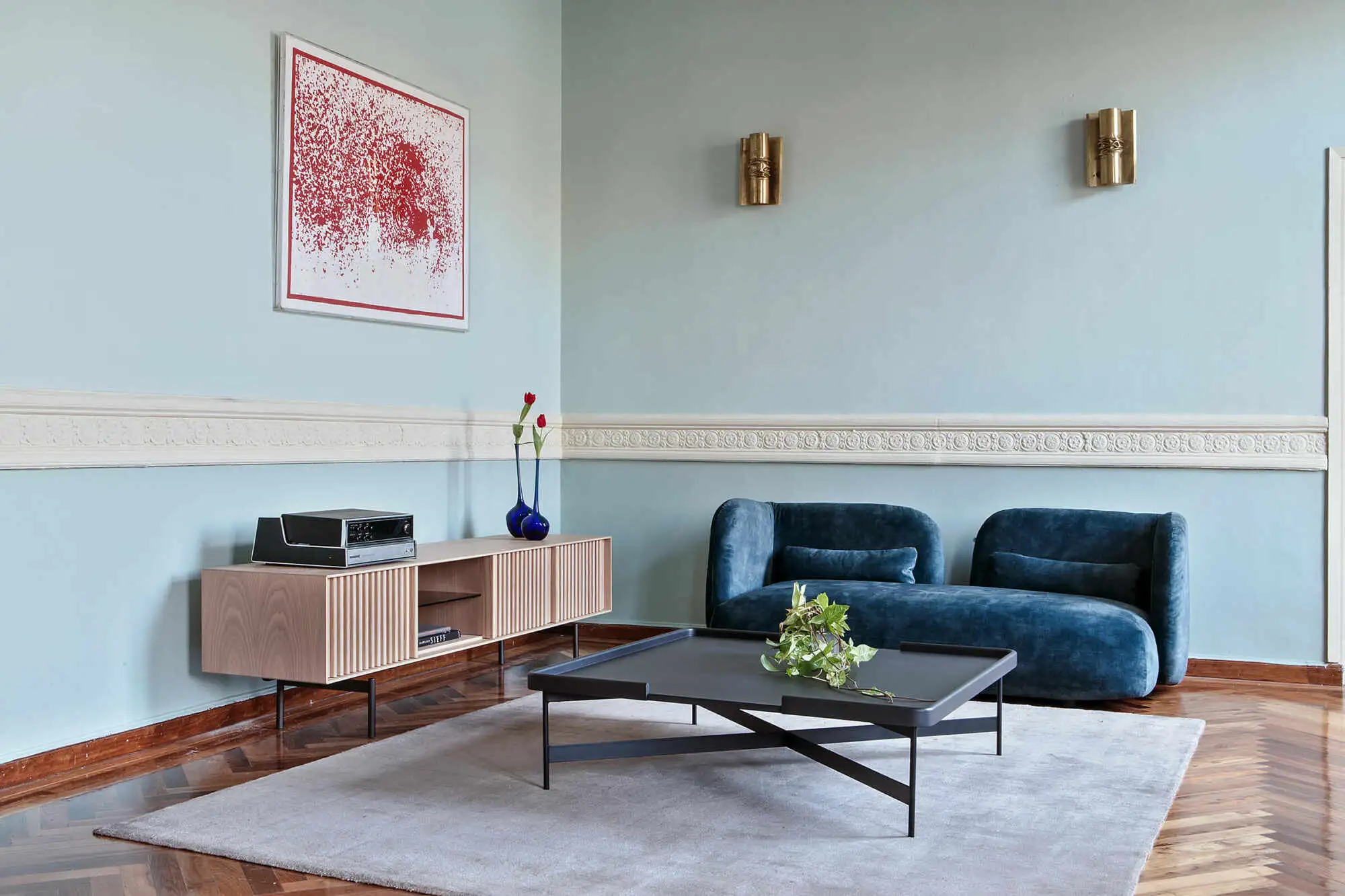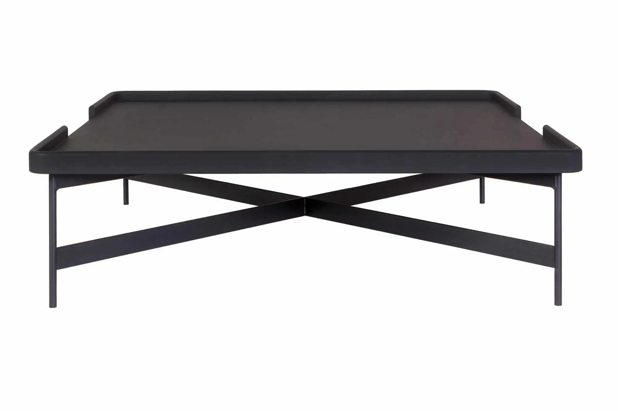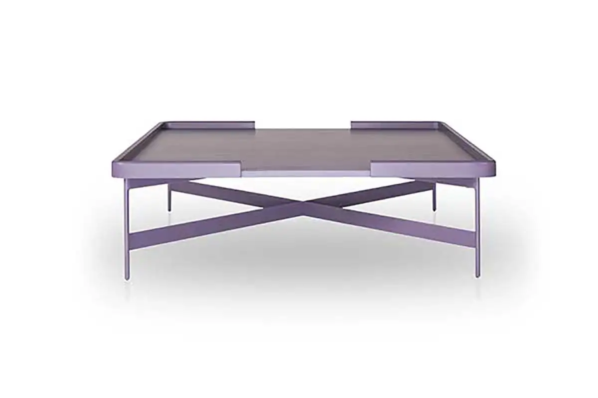 Low table with raised open edge in various sizes with wooden top and metal base.