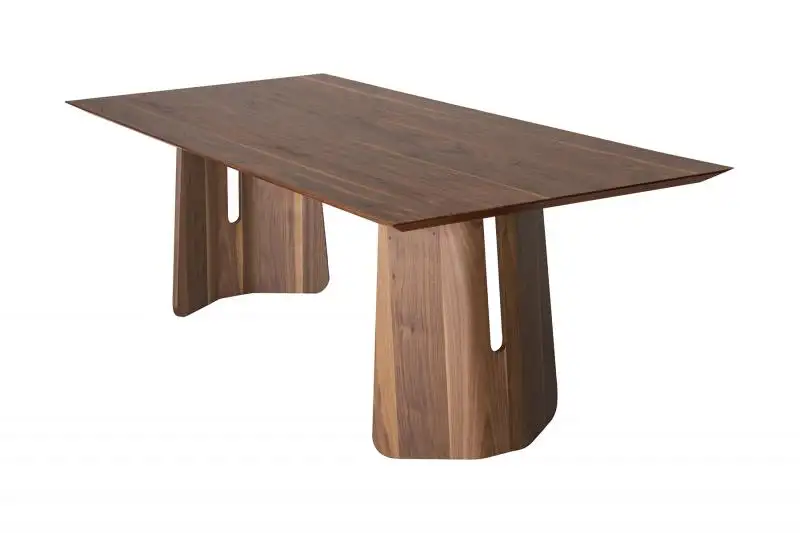Τραπέζι με παραλληλόγραμμο φάλτσο καπάκι από καπλαμά ξύλου ή λάκα ή μασίφ ξύλο και βάση από καμπυλωτό ξύλινο ηψίσυχνο .
