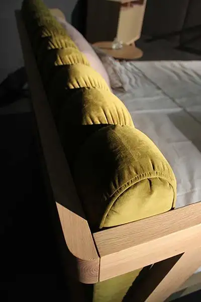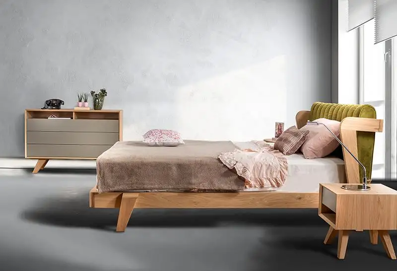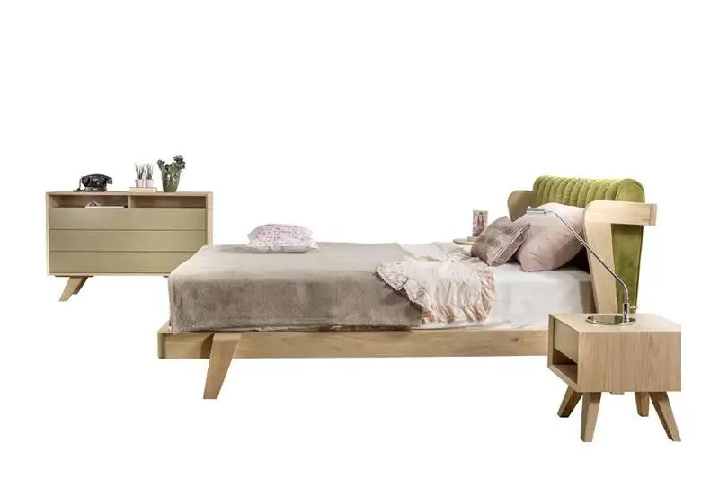 Κρεβάτι από μασίφ ξύλο με υφασμάτινο κεφαλάρι.