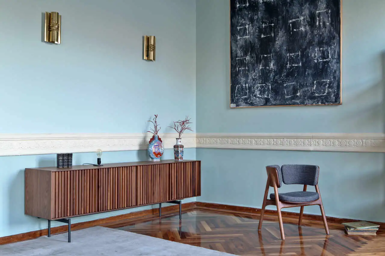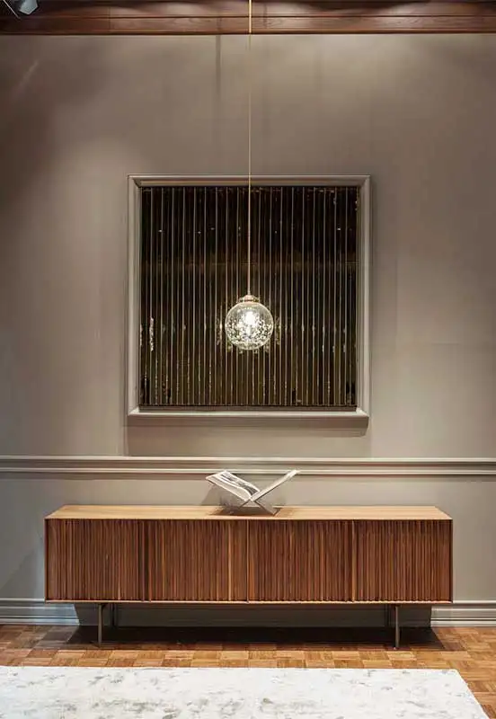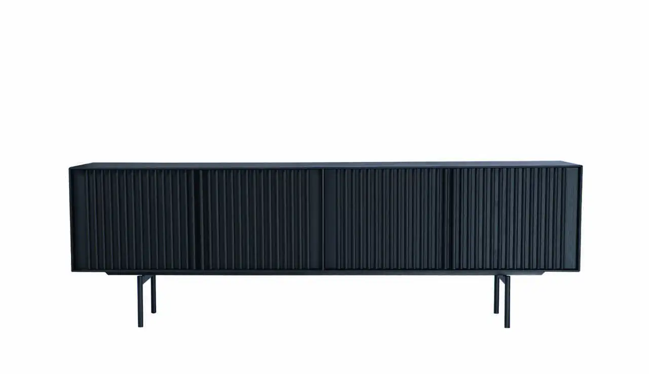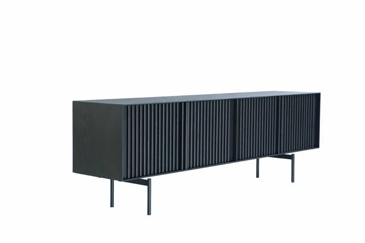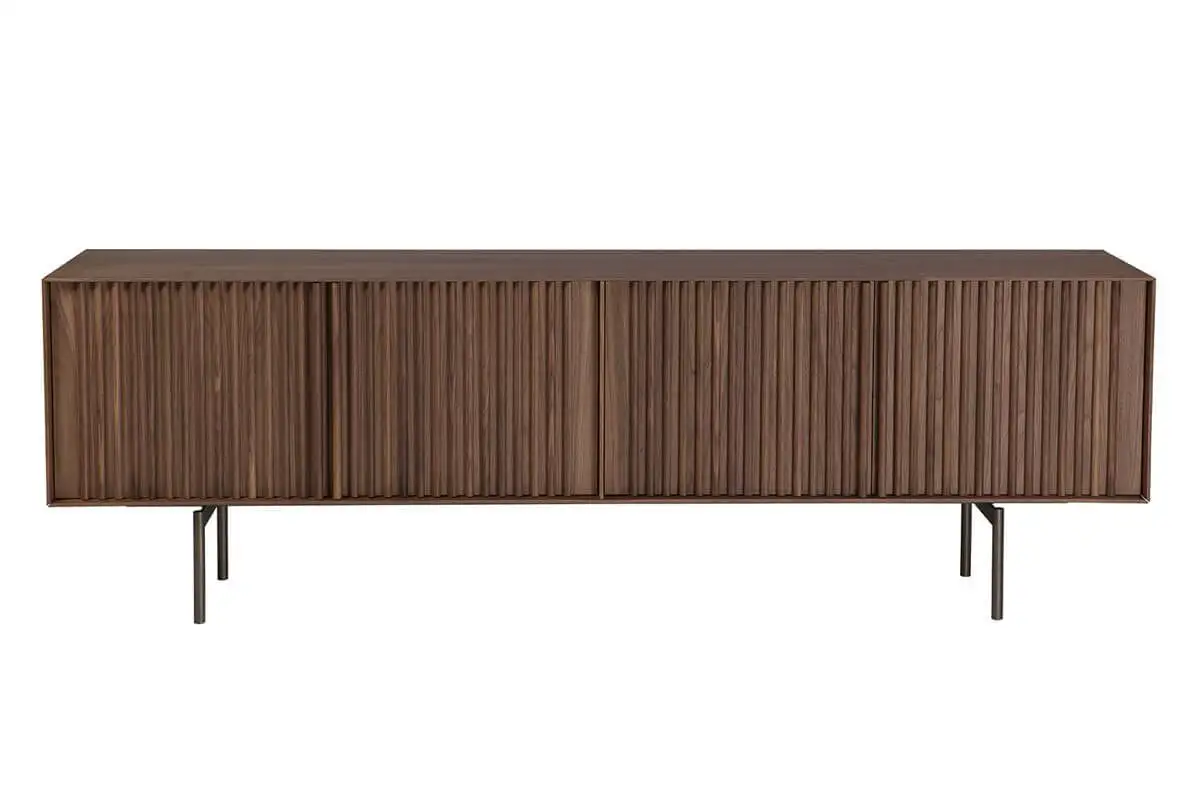 Sideboard with vertical lines in various sizes. Four doors and inside shelf. Metal base.