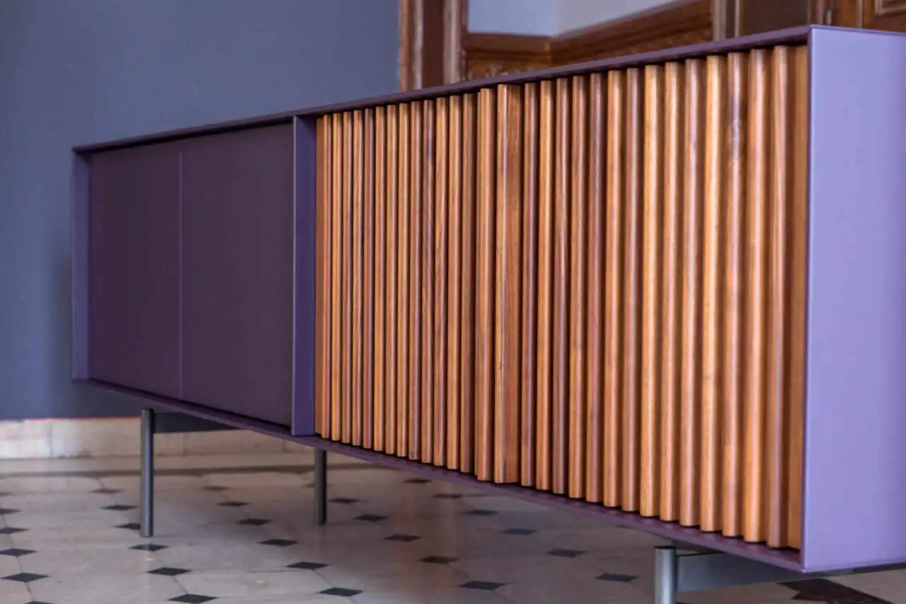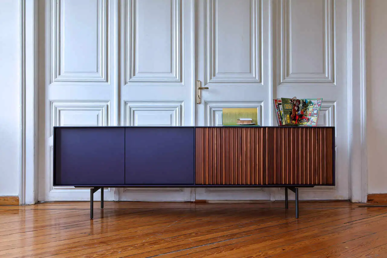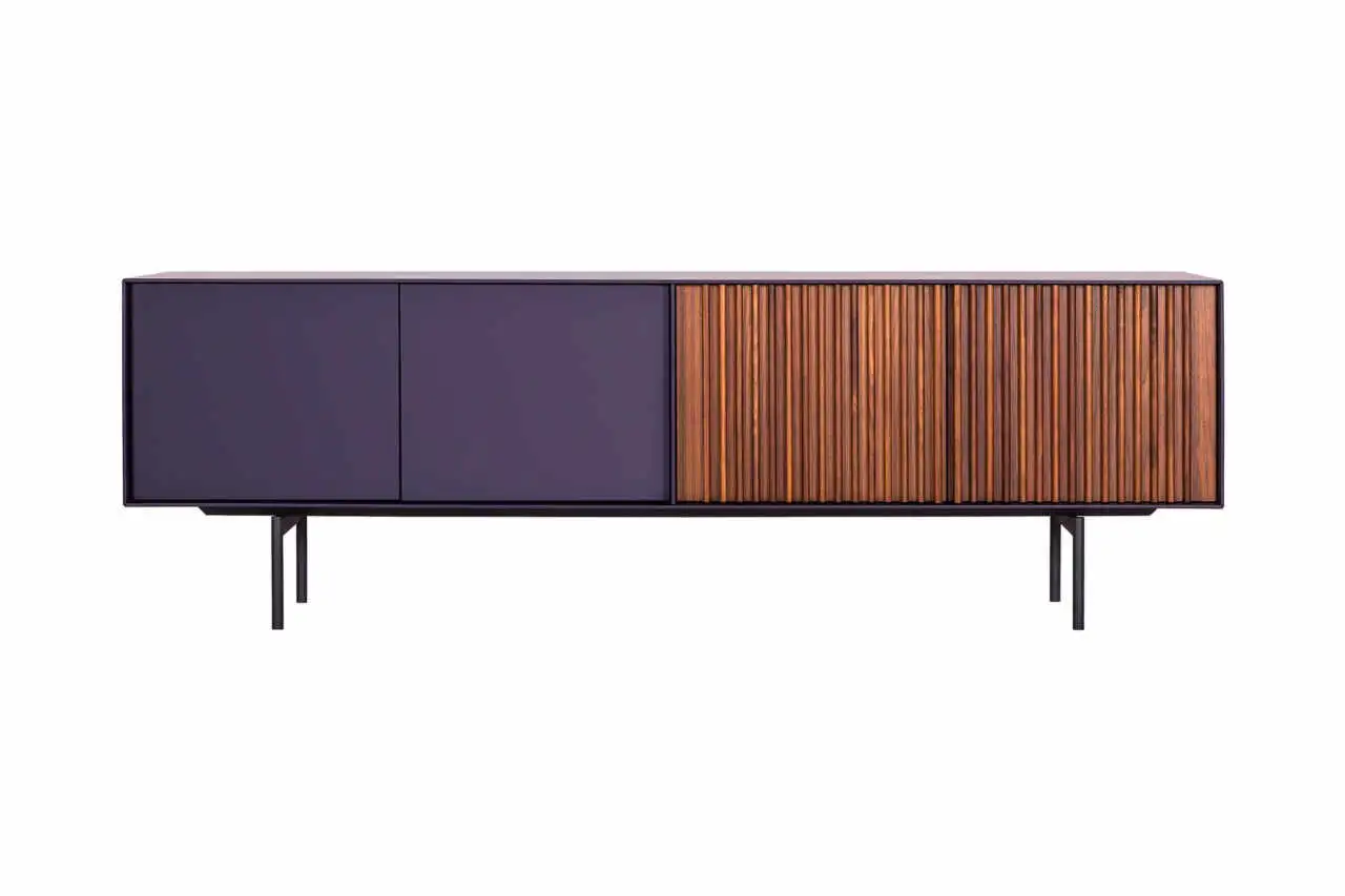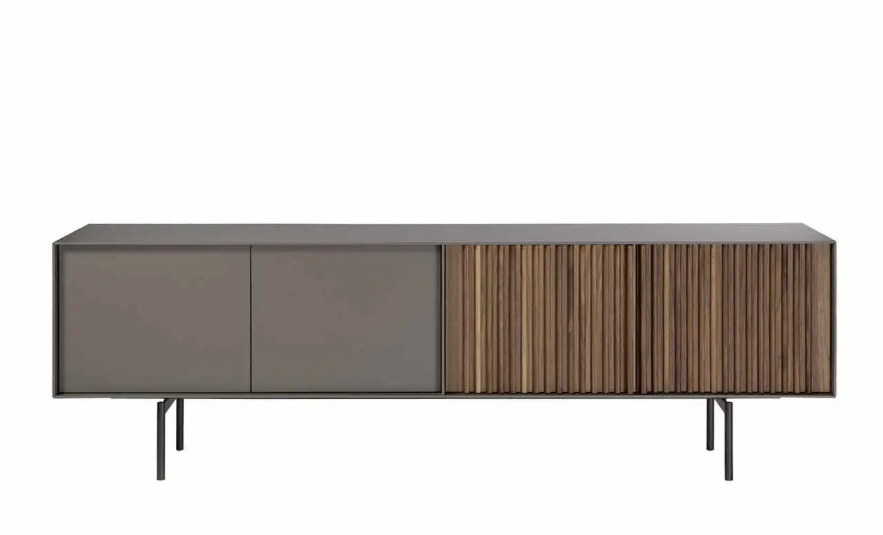 Sideboard in various sizes, with two flat, push-pull doors and two doors with vertical bars. Inside shelf. Metal base.