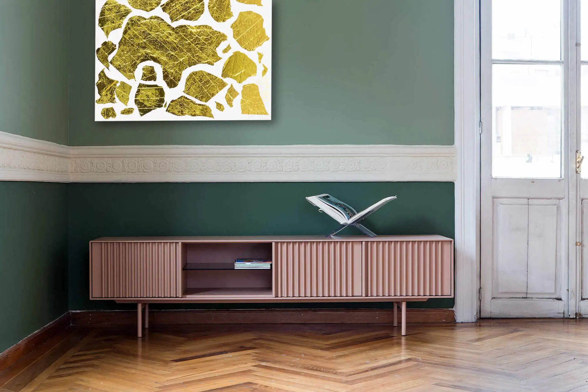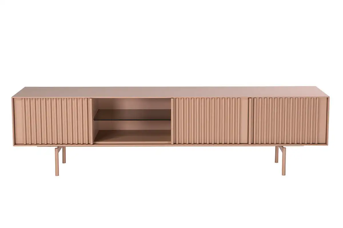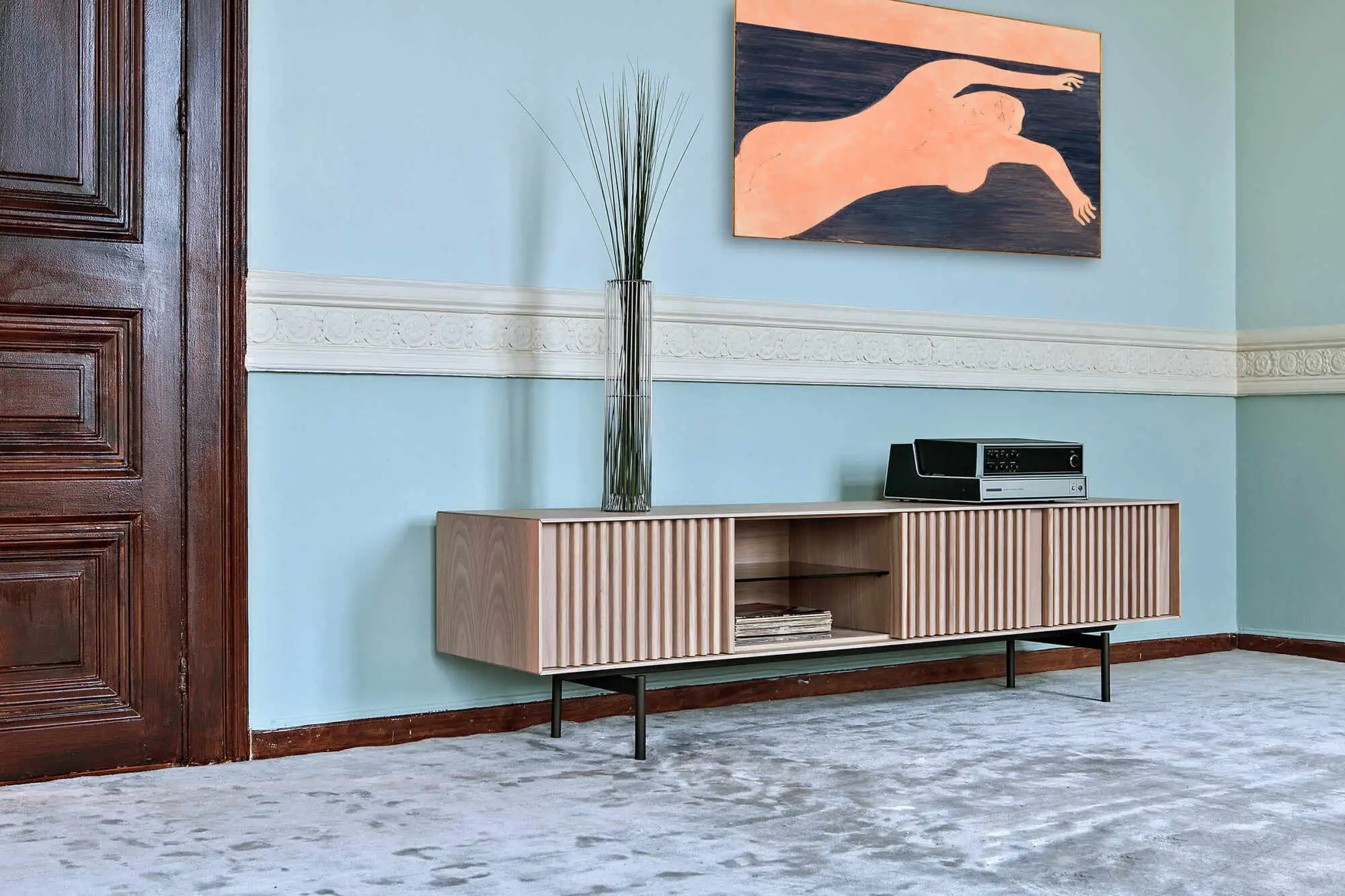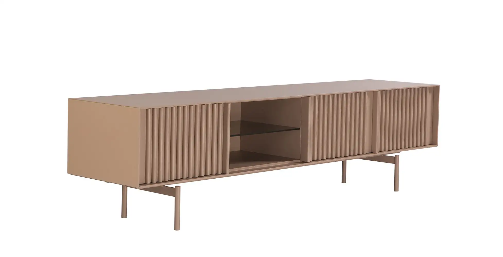 Έπιπλο TV σε διάφορα μεγέθη με τρεις πόρτες και έναν ανοιχτό χώρο με γυάλινο ράφι. Τα μπροστινά έχουν κάθετα στοιχεία από μασίφ ξύλο και η βάση είναι μεταλλική.