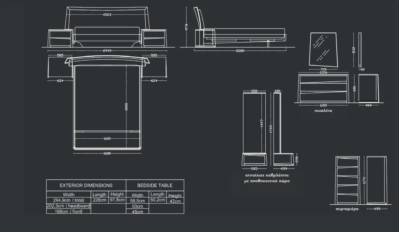 Το ΣΕΤ Κρεβατοκάμαρας: Κρεβάτι, δυο κομοδίνα, τουαλέτα και τον καθρέπτη πάνω από την τουαλέτα. Εφόσον επιθυμείτε, σας δίνεται και η δυνατότητα αγοράς μεμονωμένων προϊόντων του.