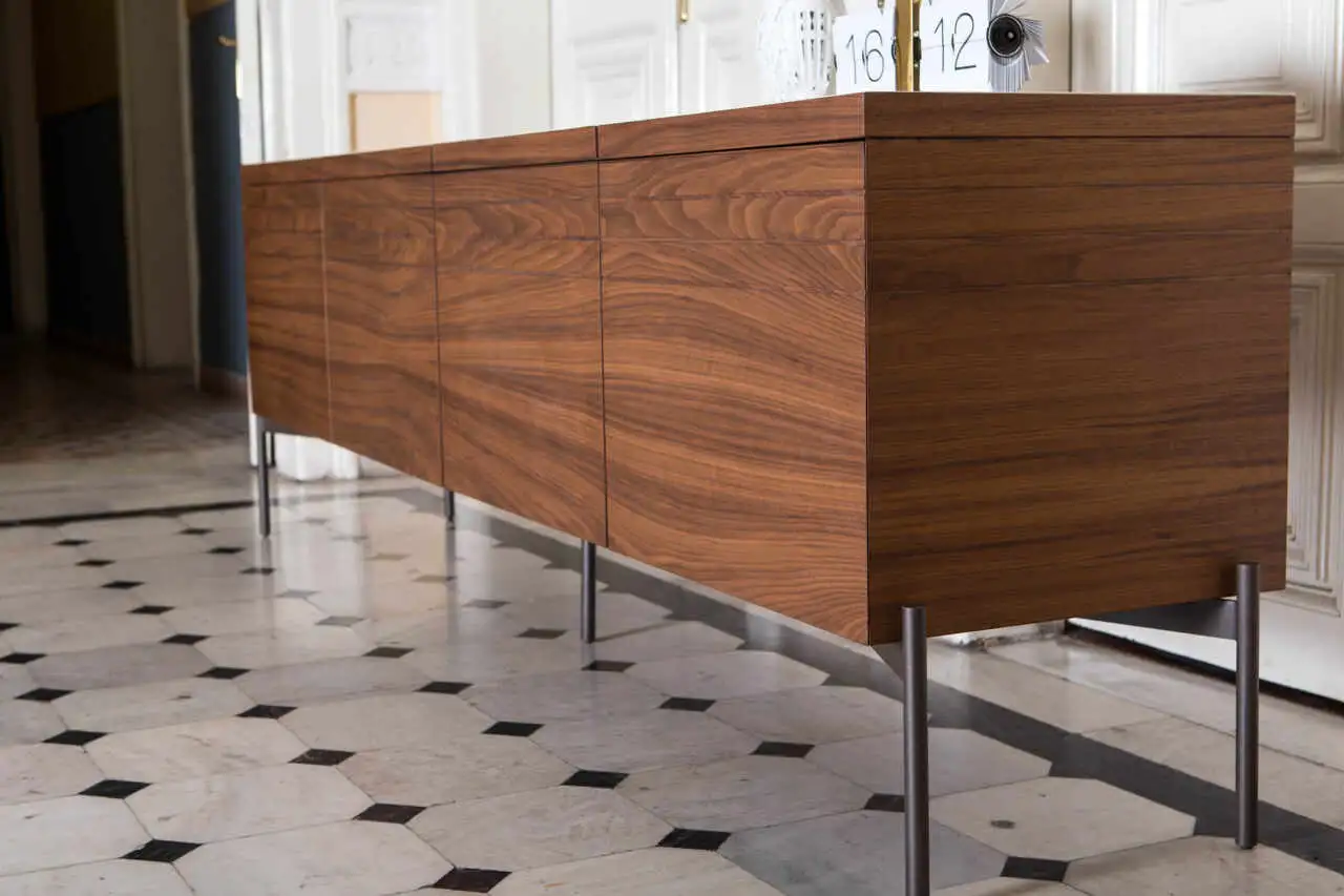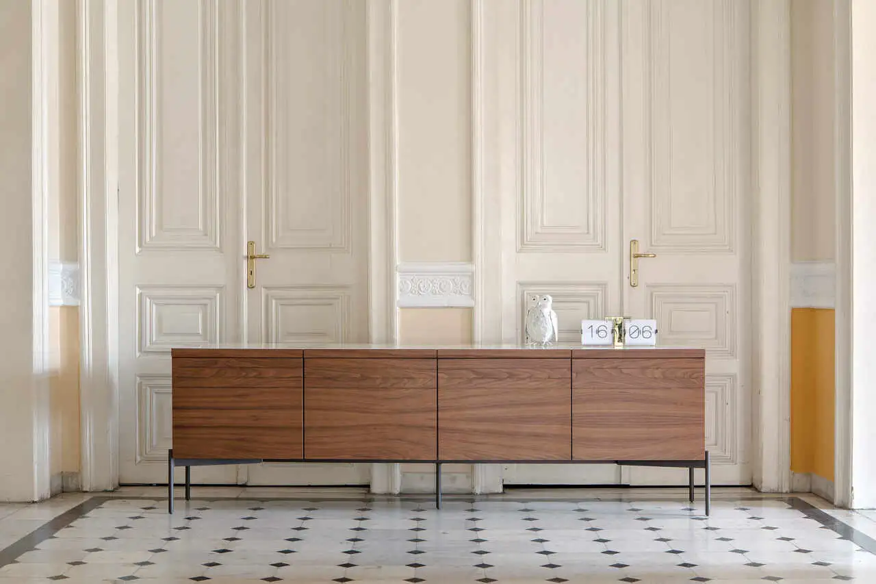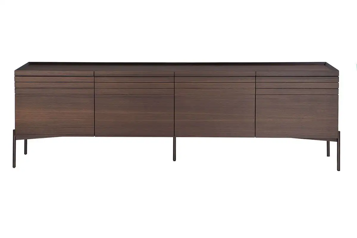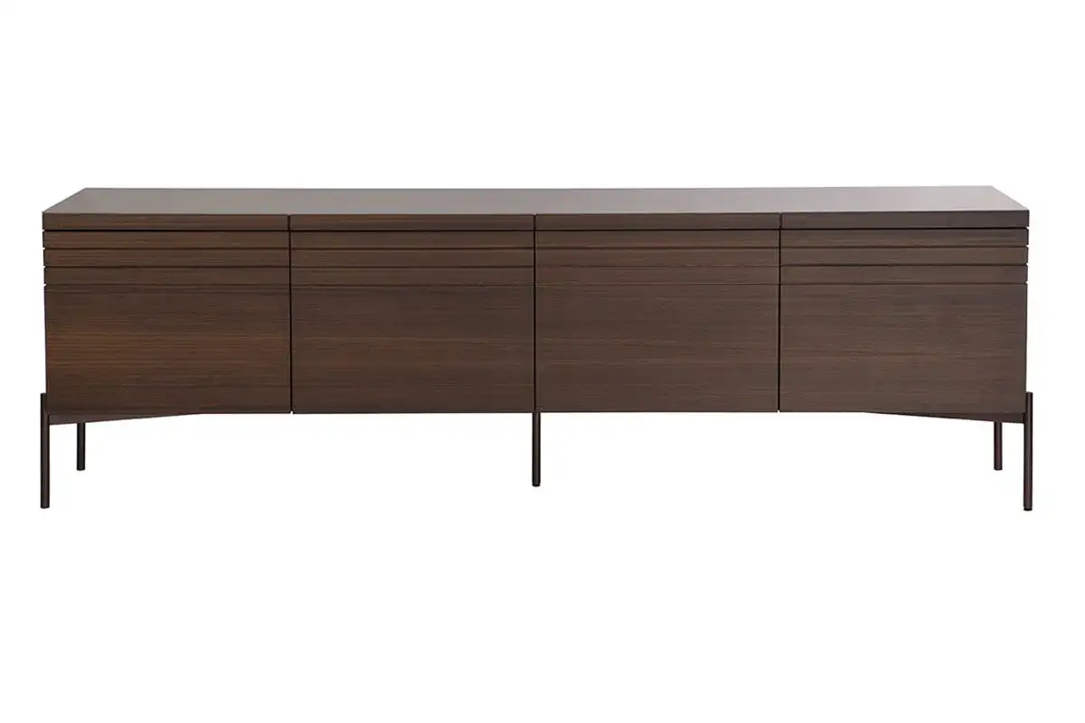 Sideboard in various sizes. Cabinet with around horizontal lines covered with solid wood and 4 push-pull doors and inside shelf. Possibility with or without top in marble or maxfine marble.
