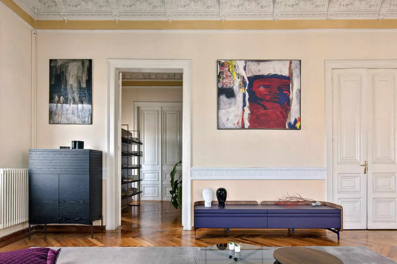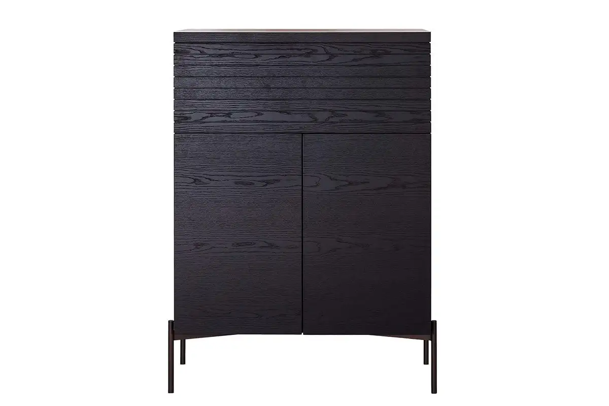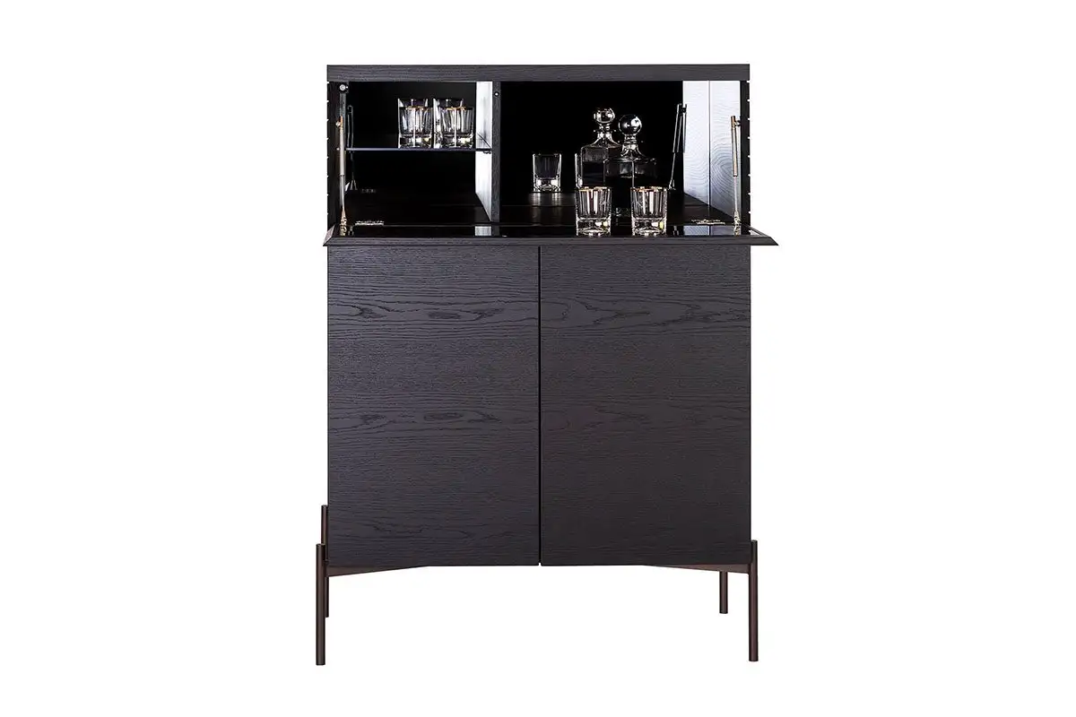 Highboard with around horizontal lines covered with solid wood, one drop door and 2 push-pull doors. Inside open space for bar with mirror back, glass shelves and led lighting.