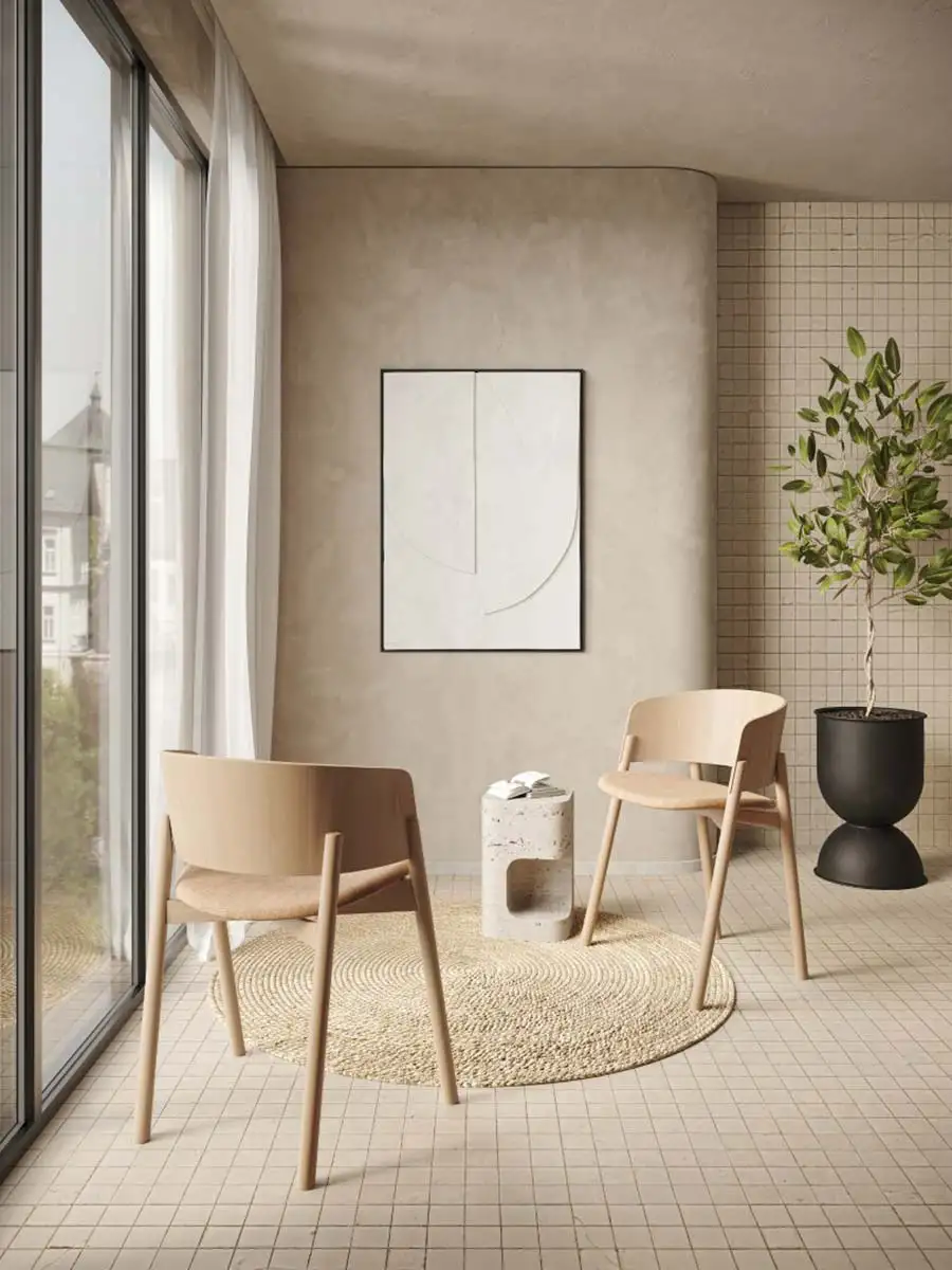 Η συλλογή Om ξεχωρίζει για τις καθαρές, ρευστές σχεδιαστικές της αρχές, αποπνέοντας δυναμισμό τόσο μέσα από τις λιτές, κυκλικές γραμμές όσο και από τα οργανικά υλικά των επίπλων.