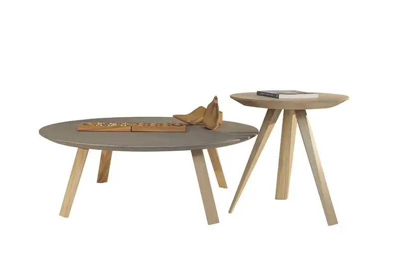 Τραπεζάκι σαλονιού με στρογγυλό καπάκι σε μασίφ ξύλο ή καπλαμά ξύλου ή λάκα και βάση μασίφ ξύλο.