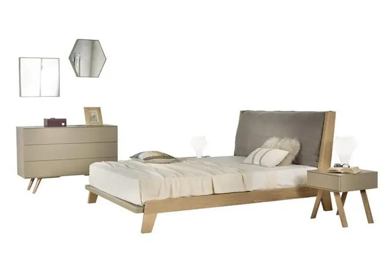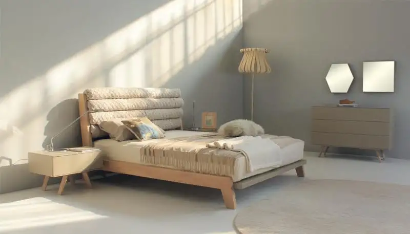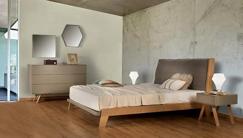 Κρεβάτι με βάση μασίφ ξύλο λακαριστή διχρωμία στο ποδαρικό και υφασμάτινο κεφαλάρι.