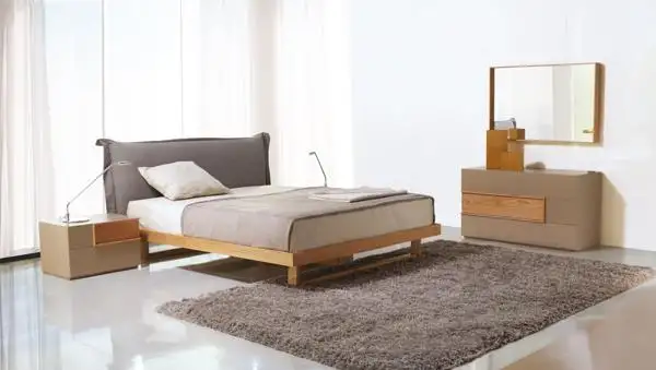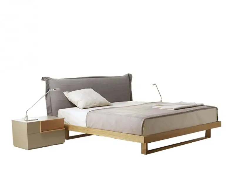 Κρεβάτι από μασίφ ξύλο με υφασμάτινο κεφαλάρι.