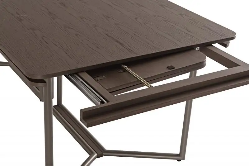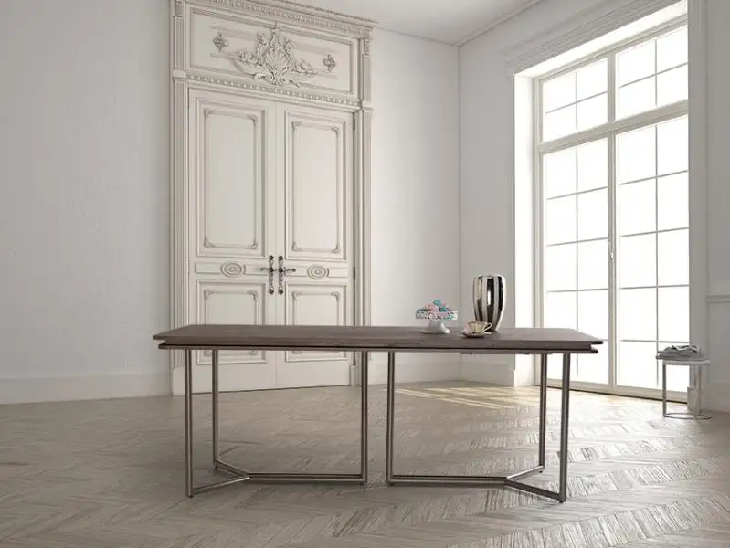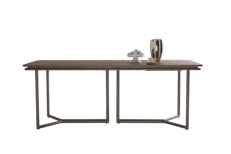 Τραπέζι με παραλληλόγραμμο καπάκι από καπλαμά ξύλου ή λάκα και μεταλλική βάση με ξύλινη λεπτομέρεια.