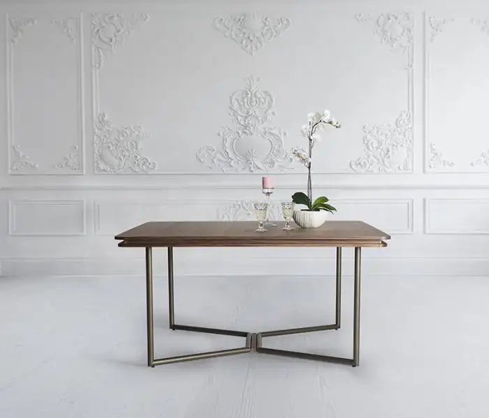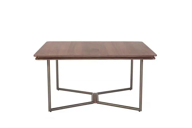 Τραπέζι με τετράγωνο καπάκι από καπλαμά ξύλου ή λάκα και μεταλλική βάση με ξύλινη λεπτομέρεια.