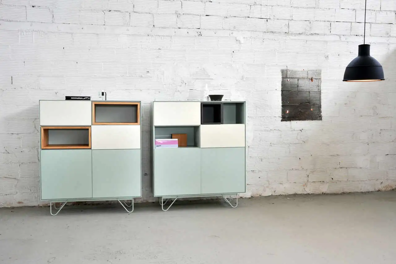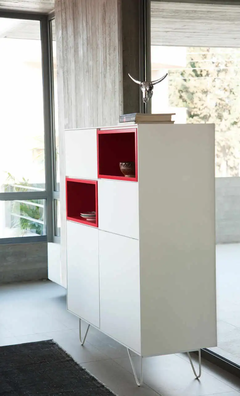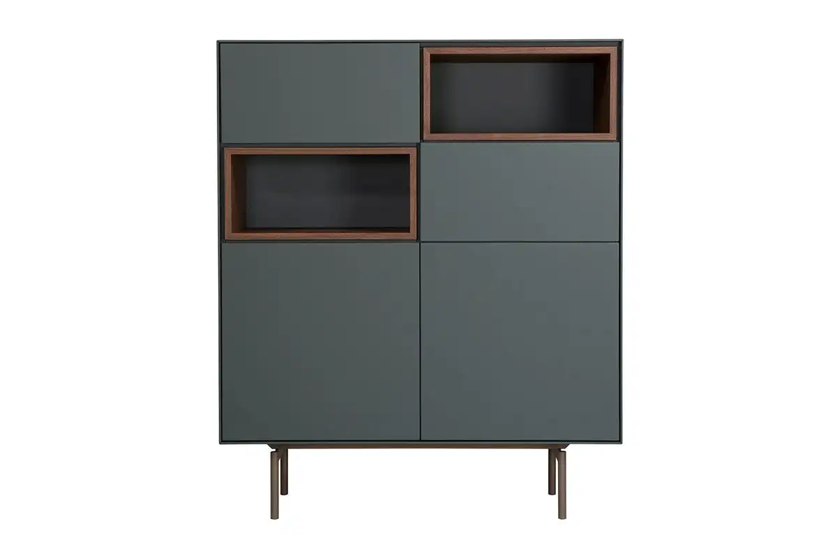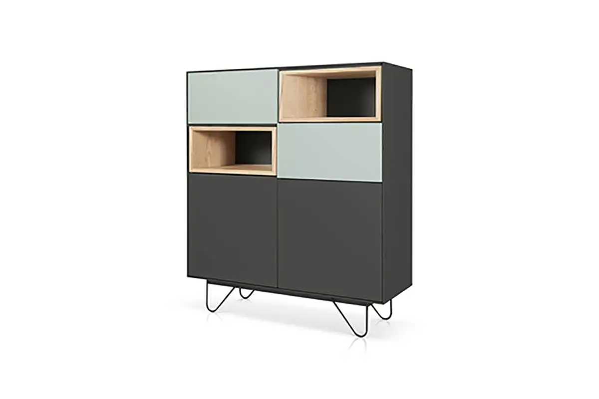 High board in two dimensions with 2 push-pull doors, 2 open spaces with boxes and 2 smaller push-pull, drop doors – lacquered or epoxy powder metal base.