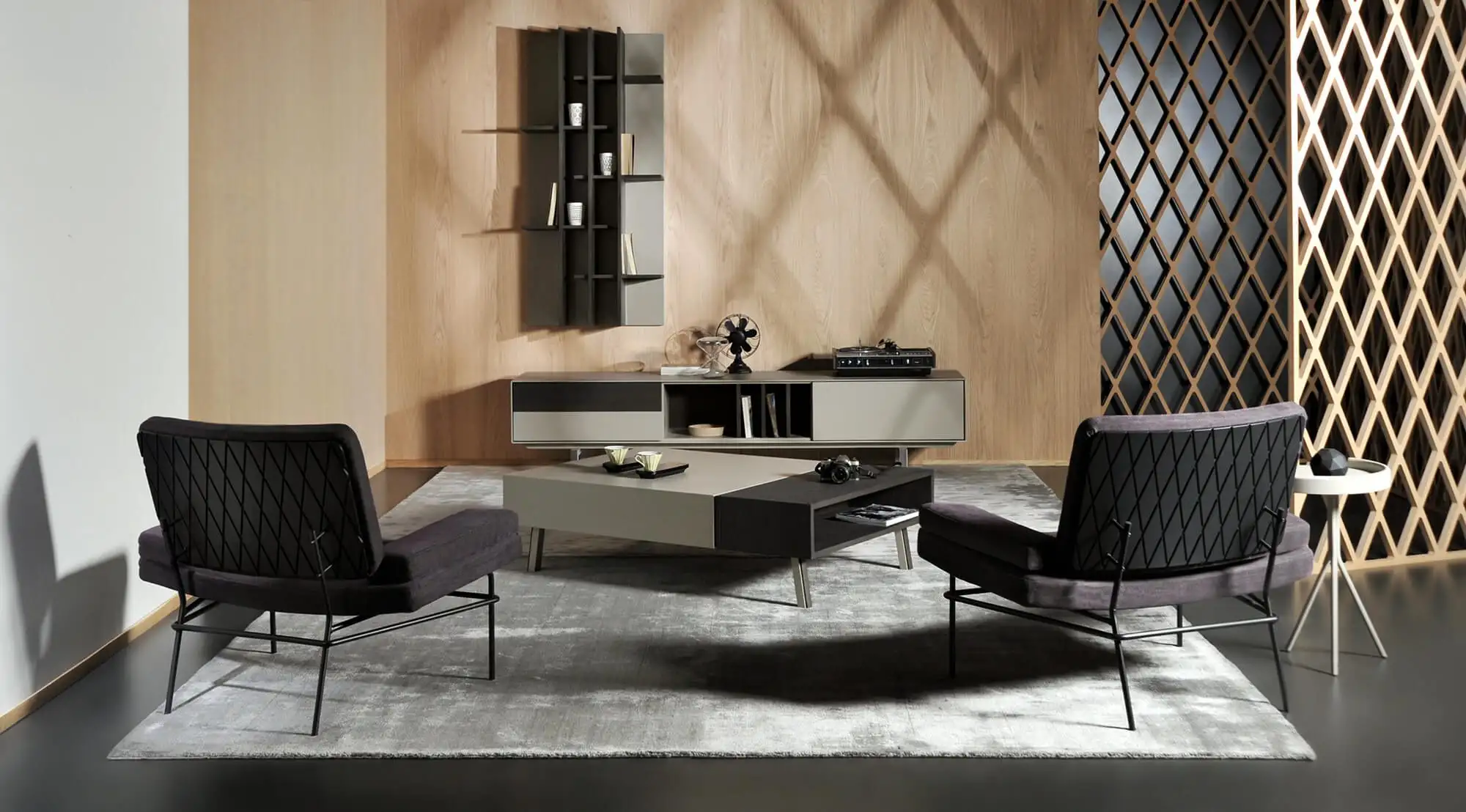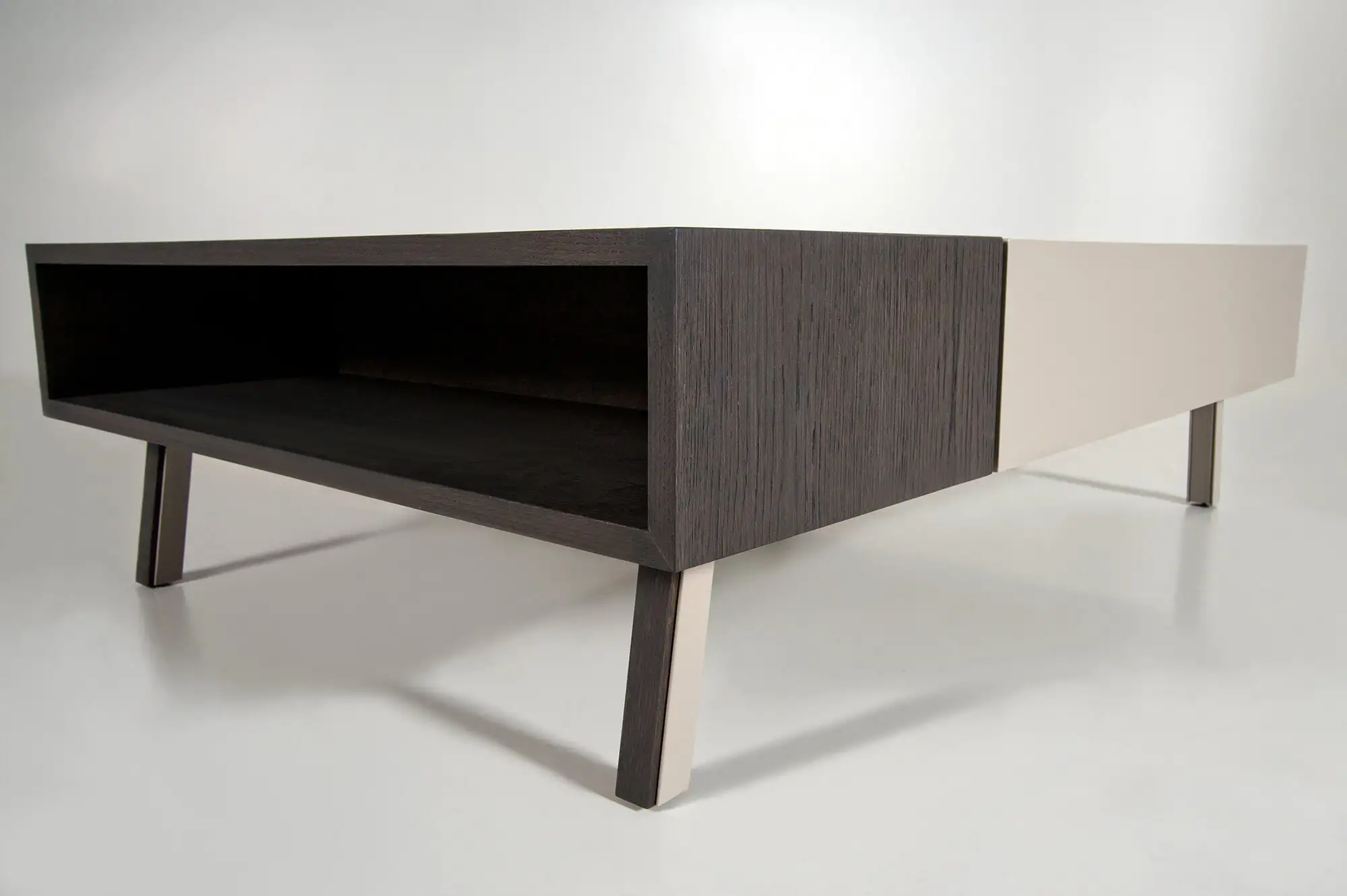 Low table in two dimensions with 2 sections of top and one side magazine rack – lacquered or epoxy powder metal base.