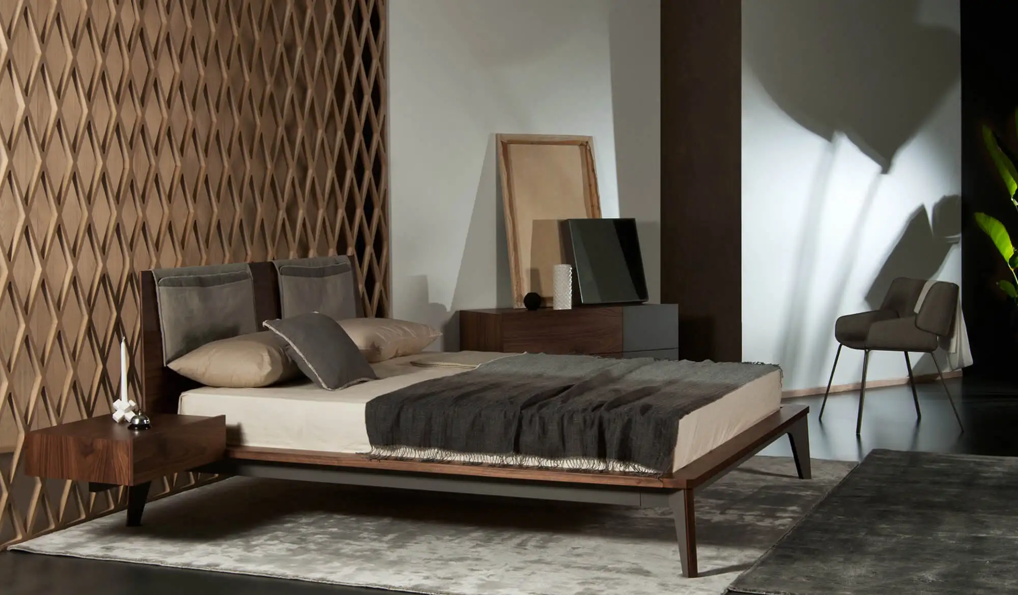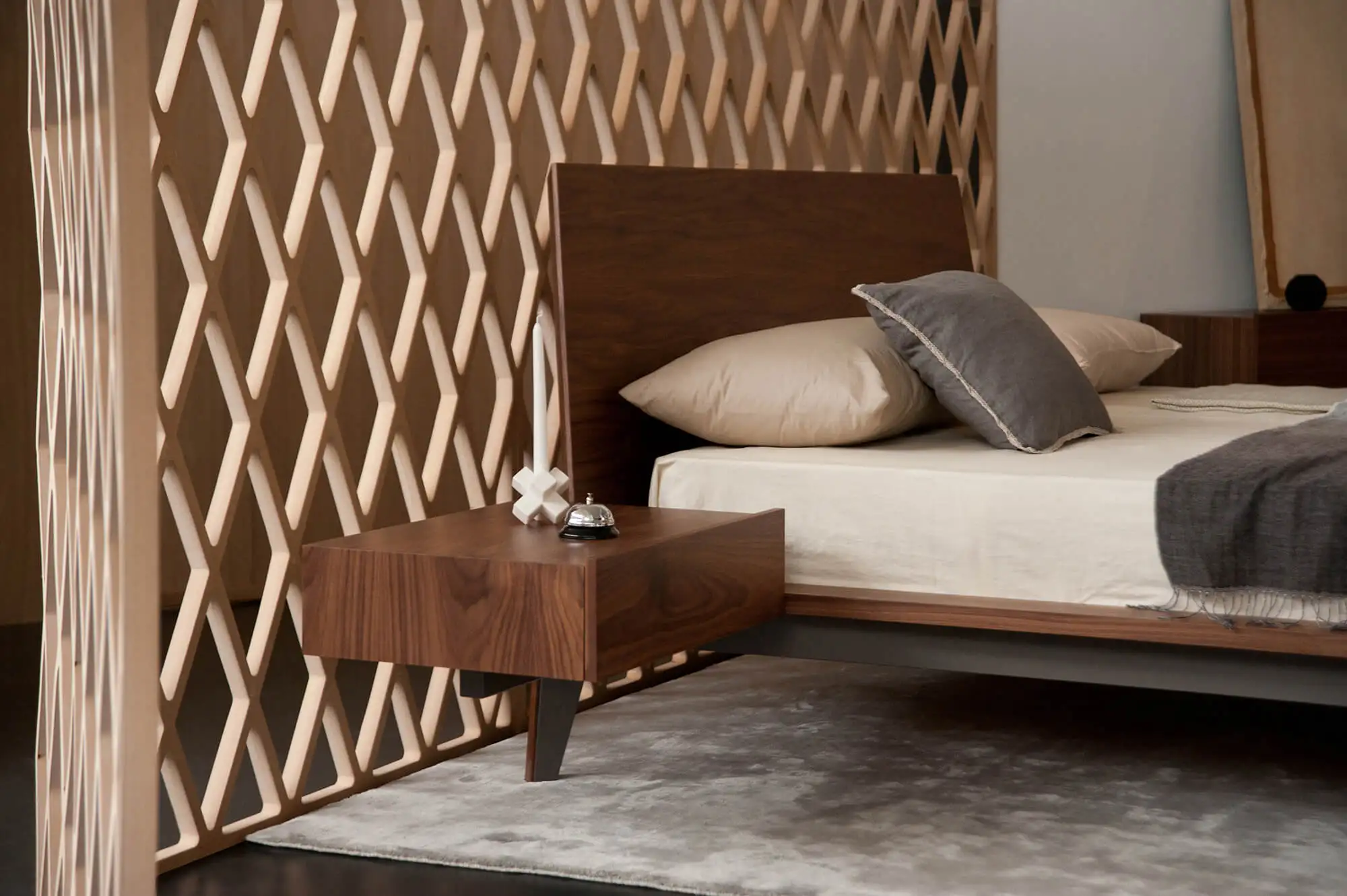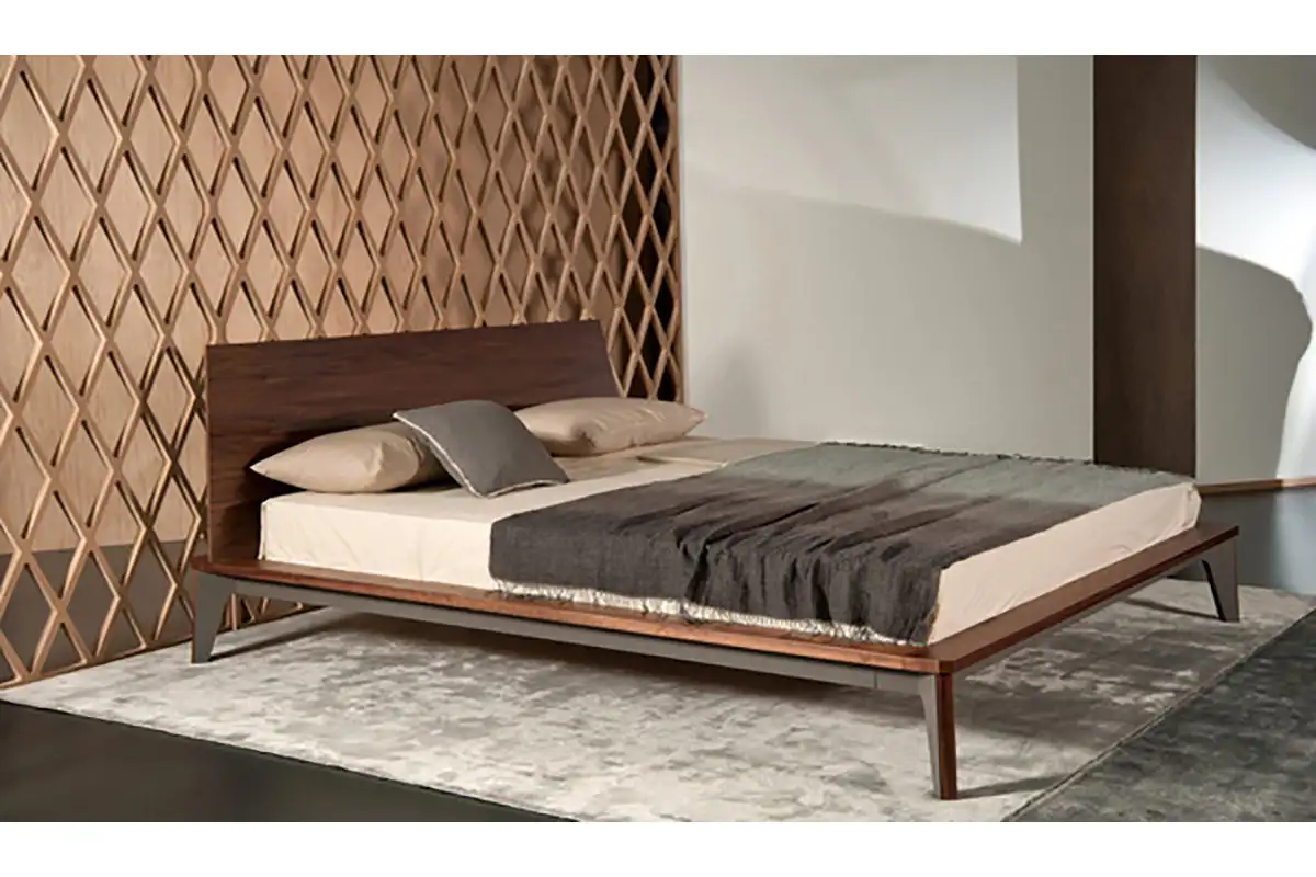 Bed in various sizes with wooden headboard and metal frame base with wooden profile.