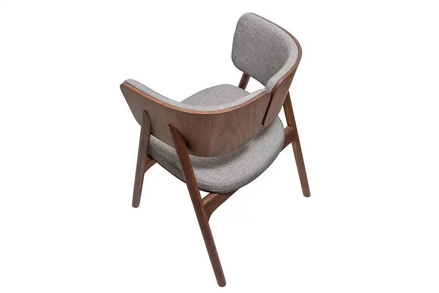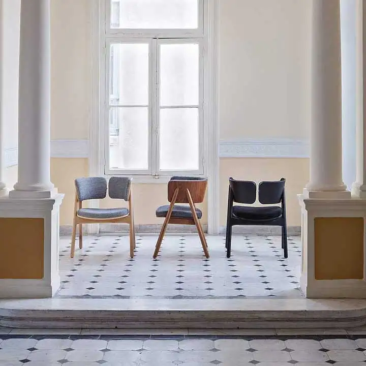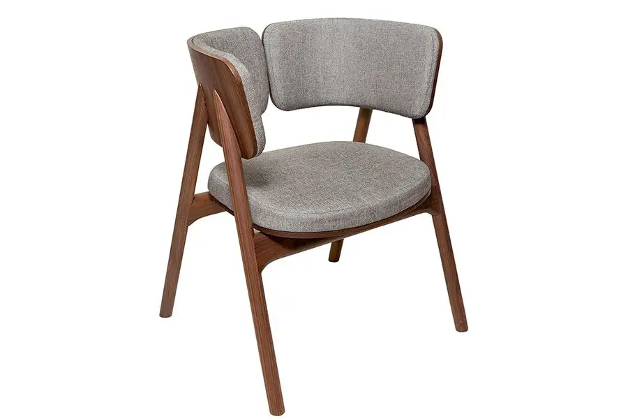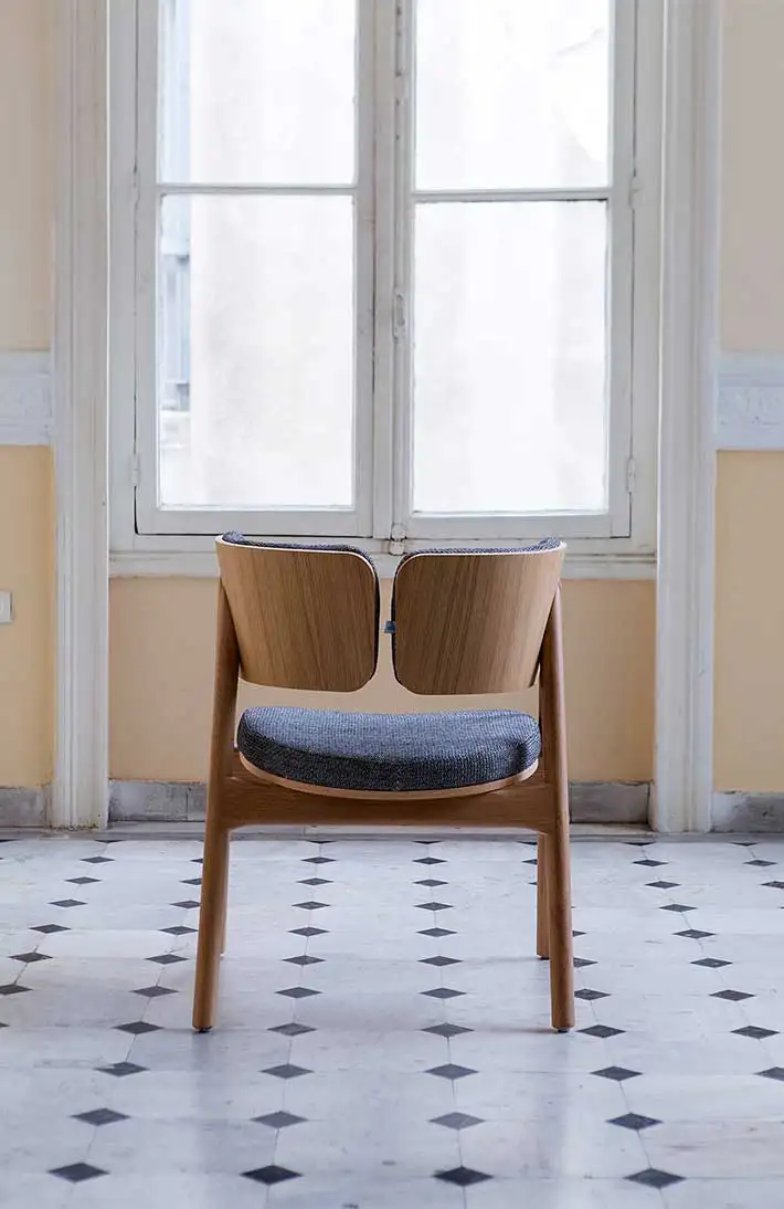 Chair in fabric with base in lacquered or solid wood.